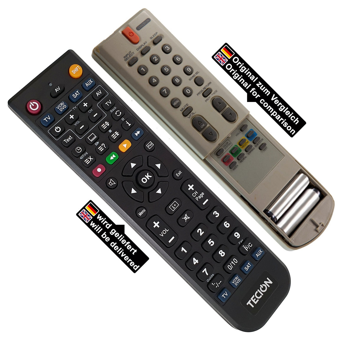 Die Tecion Fernbedienung wird vor dem Versand für Sie vorprogrammiert und anschließend auf Funktion überprüft. Alle Tasten der originalen Fernbedienung wurden ausgelesen, um auf die Tecion Fernbedienung übertragen werden zu können. Beim Batteriewechsel gehen die Funktionen nicht verloren und versehentlich können diese auch nicht verändert oder gelöscht werden. Ein Tastenbelegungsplan liegt einer jeden Bestellung anbei.