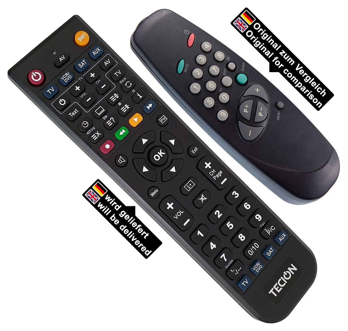 Die Tecion Fernbedienung wird vor dem Versand für Sie vorprogrammiert und anschließend auf Funktion überprüft. Alle Tasten der originalen Fernbedienung wurden ausgelesen, um auf die Tecion Fernbedienung übertragen werden zu können. Beim Batteriewechsel gehen die Funktionen nicht verloren und versehentlich können diese auch nicht verändert oder gelöscht werden. Ein Tastenbelegungsplan liegt einer jeden Bestellung anbei.