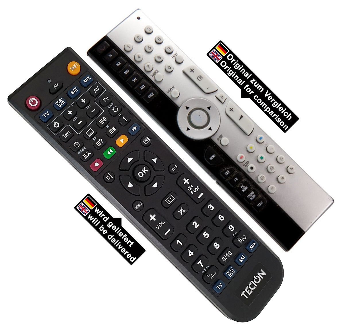 Die Tecion Fernbedienung wird vor dem Versand für Sie vorprogrammiert und anschließend auf Funktion überprüft. Alle Tasten der originalen Fernbedienung wurden ausgelesen, um auf die Tecion Fernbedienung übertragen werden zu können. Beim Batteriewechsel gehen die Funktionen nicht verloren und versehentlich können diese auch nicht verändert oder gelöscht werden. Ein Tastenbelegungsplan liegt einer jeden Bestellung anbei.