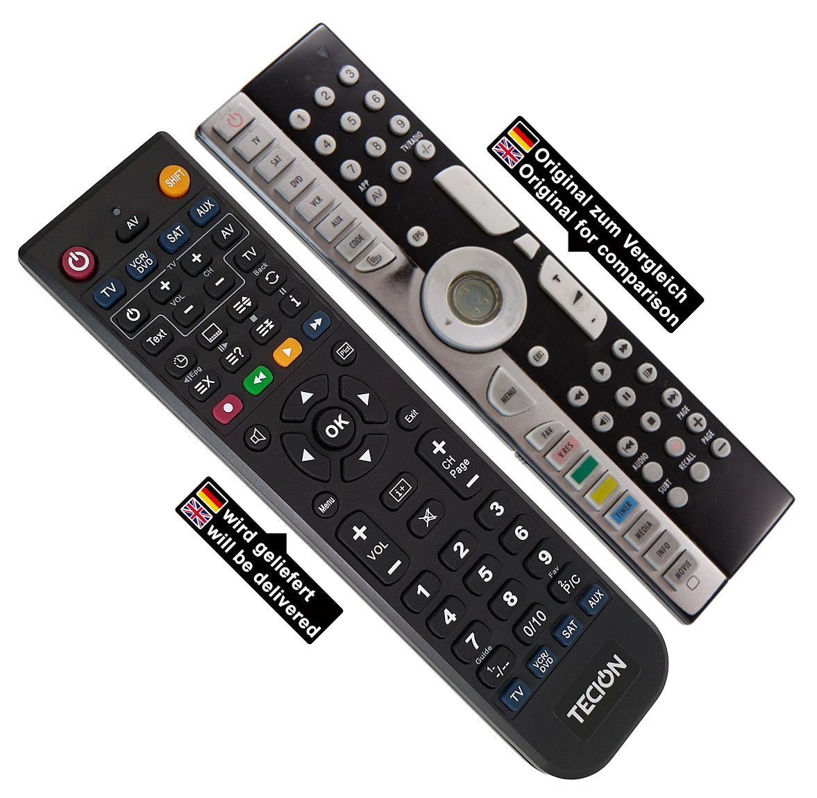 Die Tecion Fernbedienung wird vor dem Versand für Sie vorprogrammiert und anschließend auf Funktion überprüft. Alle Tasten der originalen Fernbedienung wurden ausgelesen, um auf die Tecion Fernbedienung übertragen werden zu können. Beim Batteriewechsel gehen die Funktionen nicht verloren und versehentlich können diese auch nicht verändert oder gelöscht werden. Ein Tastenbelegungsplan liegt einer jeden Bestellung anbei.