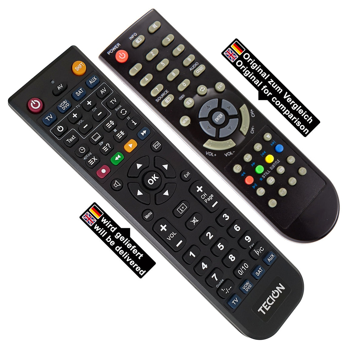 Die Tecion Fernbedienung wird vor dem Versand für Sie vorprogrammiert und anschließend auf Funktion überprüft. Alle Tasten der originalen Fernbedienung wurden ausgelesen, um auf die Tecion Fernbedienung übertragen werden zu können. Beim Batteriewechsel gehen die Funktionen nicht verloren und versehentlich können diese auch nicht verändert oder gelöscht werden. Ein Tastenbelegungsplan liegt einer jeden Bestellung anbei.