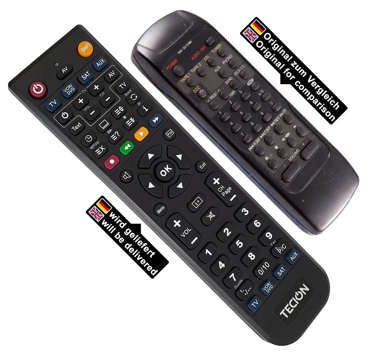 Die Tecion Fernbedienung wird vor dem Versand für Sie vorprogrammiert und anschließend auf Funktion überprüft. Alle Tasten der originalen Fernbedienung wurden ausgelesen, um auf die Tecion Fernbedienung übertragen werden zu können. Beim Batteriewechsel gehen die Funktionen nicht verloren und versehentlich können diese auch nicht verändert oder gelöscht werden. Ein Tastenbelegungsplan liegt einer jeden Bestellung anbei.
