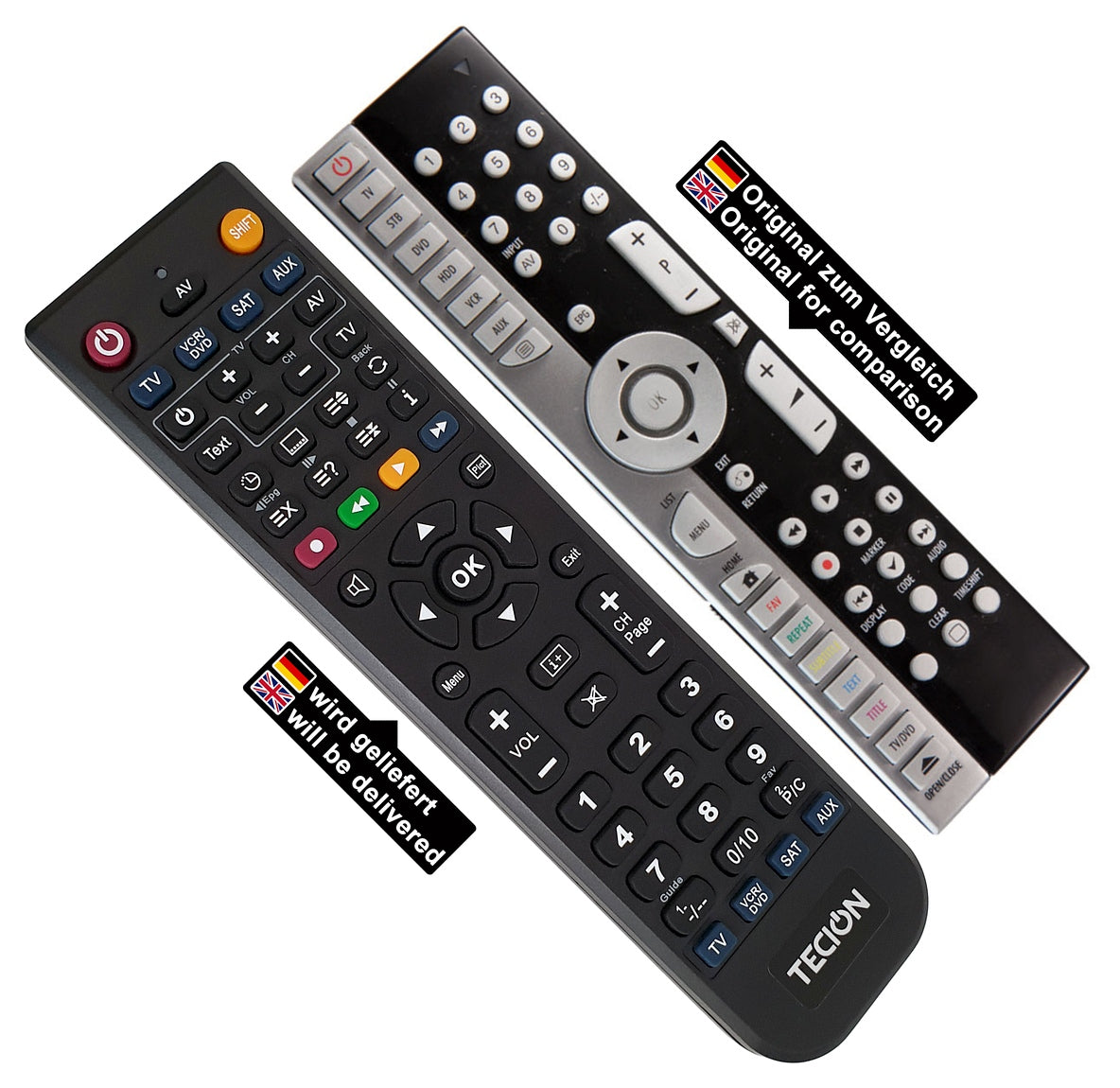 Die Tecion Fernbedienung wird vor dem Versand für Sie vorprogrammiert und anschließend auf Funktion überprüft. Alle Tasten der originalen Fernbedienung wurden ausgelesen, um auf die Tecion Fernbedienung übertragen werden zu können. Beim Batteriewechsel gehen die Funktionen nicht verloren und versehentlich können diese auch nicht verändert oder gelöscht werden. Ein Tastenbelegungsplan liegt einer jeden Bestellung anbei.